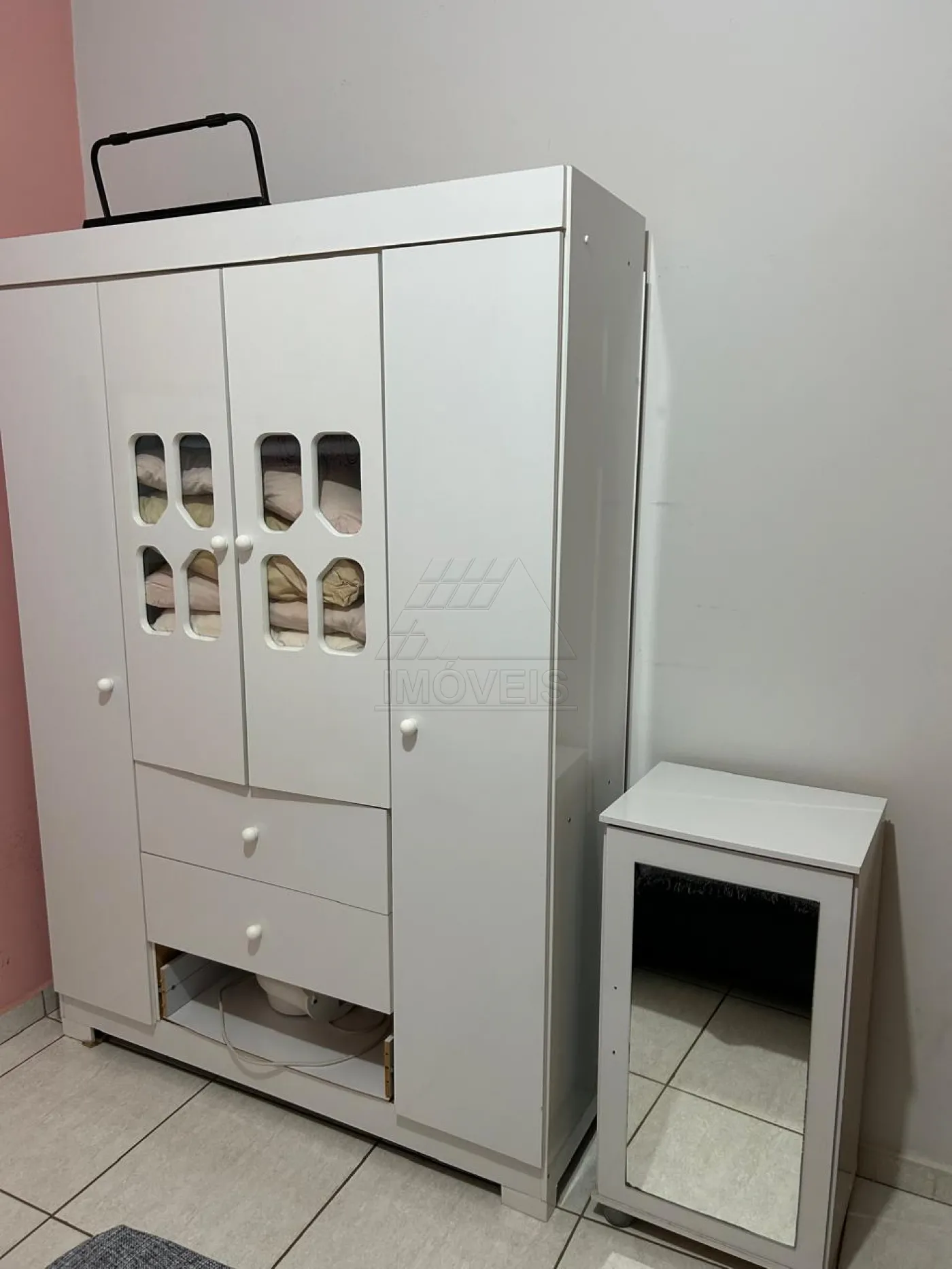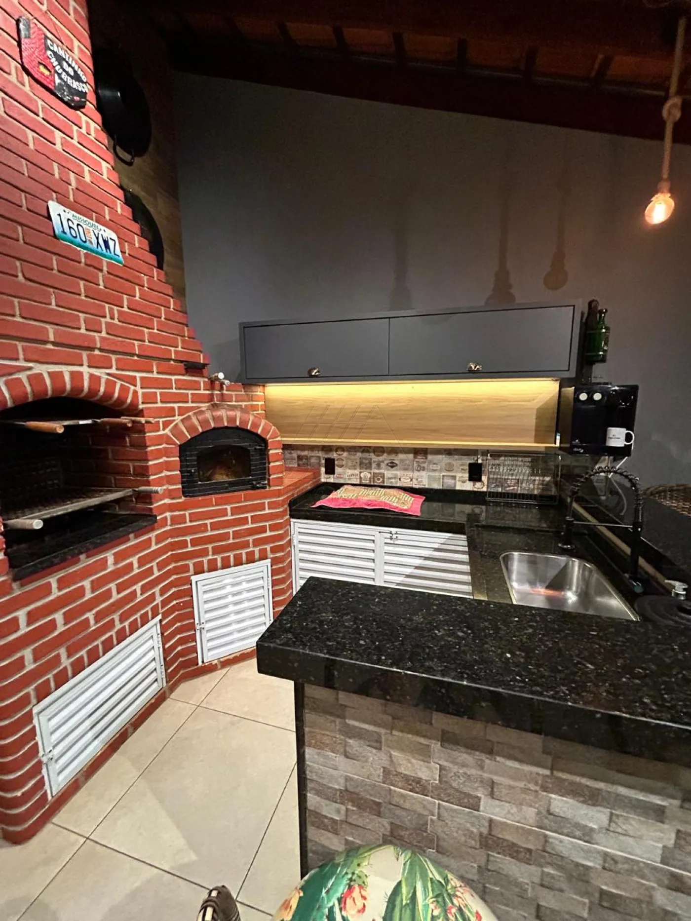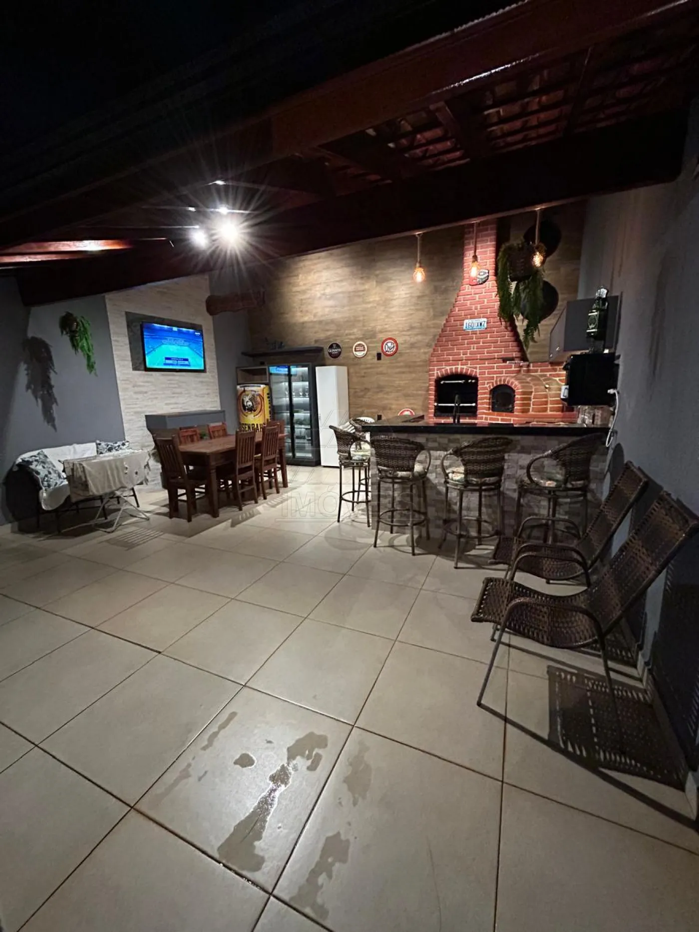 Constituída por 2 dormitórios com cama, armário e ar condicionado, sala de TV, cozinha e banheiro social com gabinete. Nos fundos, contém área de serviço, uma ampla área gourmet com churrasqueira, armário marcenaria, cooktop, geladeira, televisão 55 polegadas, mesa de jantar, banquetas, mesas e cadeiras para festas, forno de pizza e banheiro. Na lavanderia possui máquina de lavar e tanquinho. Possui 2 vagas de garagem cobertas e portão eletrônico.