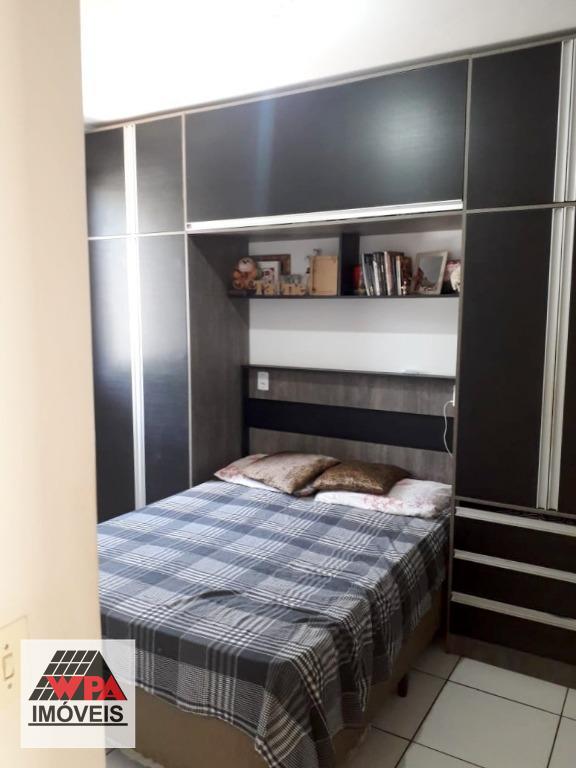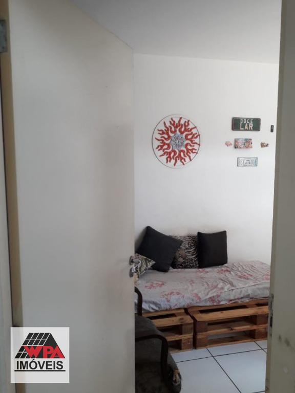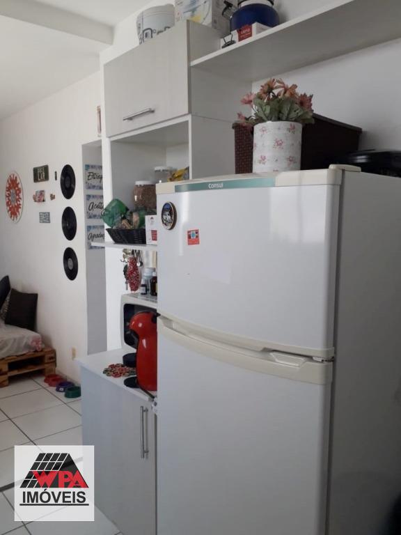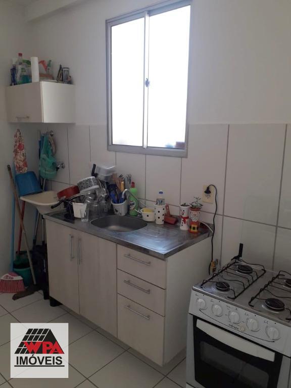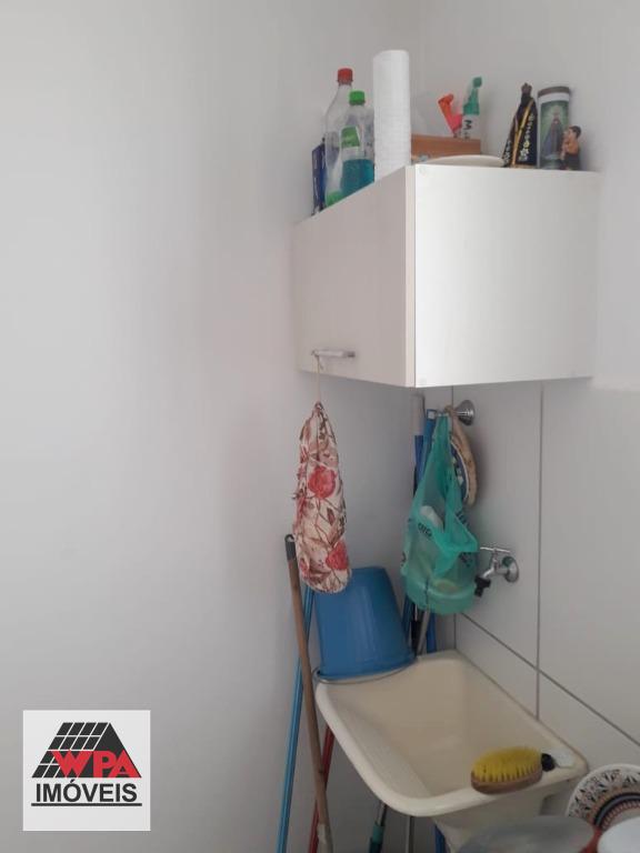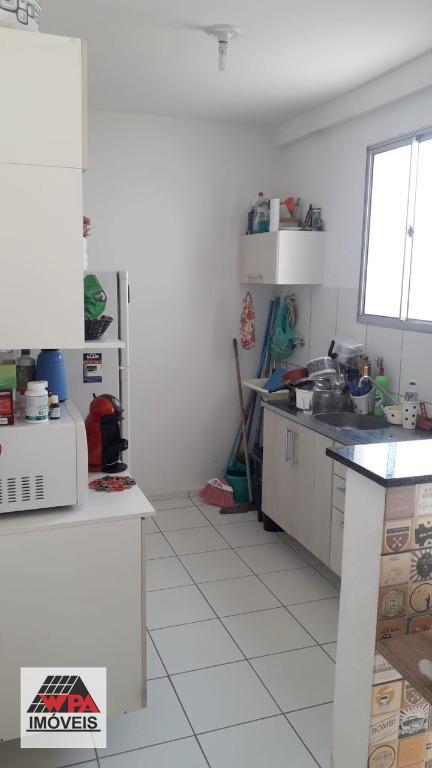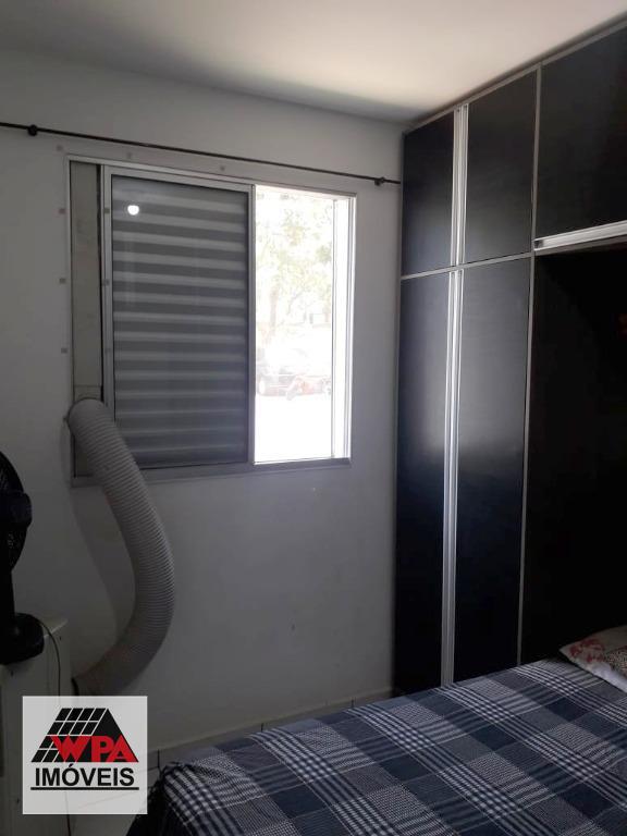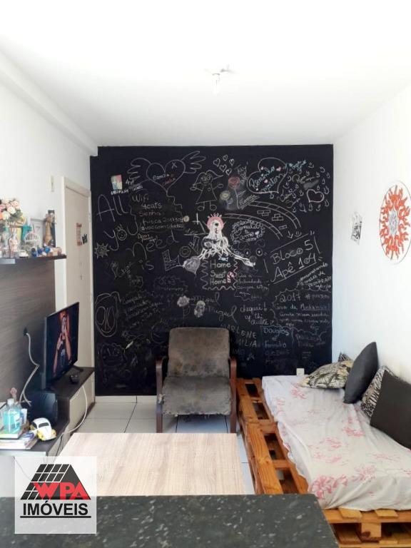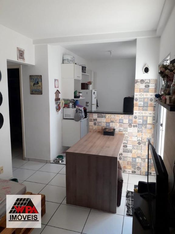 Apartamento térreo 46m² com 2 dormitórios, sendo 1 com planejado, sala 2 ambientes, cozinha com armário, banheiro social com gabinete, área de serviço e quiltal. Possui 1 vaga de garagem descoberta. Condomínio com portaria 24hrs, poço artesiano, espaço gourmet com churrasqueira, salão festas, academia e playground. Aceita financiamento com FGTS.